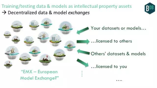 生态系统内:竞争对手(例如,银行或唱片公司)过去永远不会分享他们的数据。但现在可能坦率地展示,结合几个银行的数据,可以做更好的模型以预防信用卡欺诈。或者供应链机构通过区块链共享数据,对供应链中更早地数据使用人工智能,可以更好地确定在供应链中导致失败的根本原因。例如,大肠杆菌的菌株究竟出现在哪里?