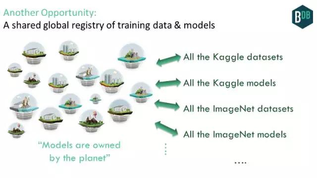 囤积 vs 分享?此处的两个相反动机之间有一个紧张关系。一个是囤积数据——即「数据是新护城河」的观点;另一个是共享数据,为了得到更好的/新的模式。分享行为必须要有一个超过「护城河」效益的足够驱动力。技术驱动力是得到更好的模式或新的模式,但这个驱动力必须要有商业价值。可能带来的利益包括降低原材料或供应链中的保险储蓄诈骗;将 Mechanical Turk 作为赚钱副业;数据/模型交换;或是对抗强大的核心玩家的集体行动,就像唱片公司合力对抗苹果的 iTunes 一样,等等;它需要创造性的商业策略。