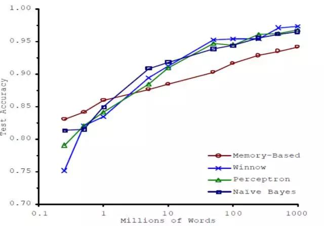 但是,世界变化了。2001 年,微软研究人员 Banko 和 Brill 发表了一篇有着显著成果的论文。首先,他们描述了大多数自然语言处理领域的工作基于小于 100 万字的小数据集上的情况。在这种情况下,对于旧/无聊/不那么花哨的算法,错误率为 25%,如朴素贝叶斯(Naive Bayes)和感知器(Perceptron),而花哨的较新的基于记忆的算法(memory-based algorithms)实现了 19%的错误率。这是下面最左边的四个数据点。