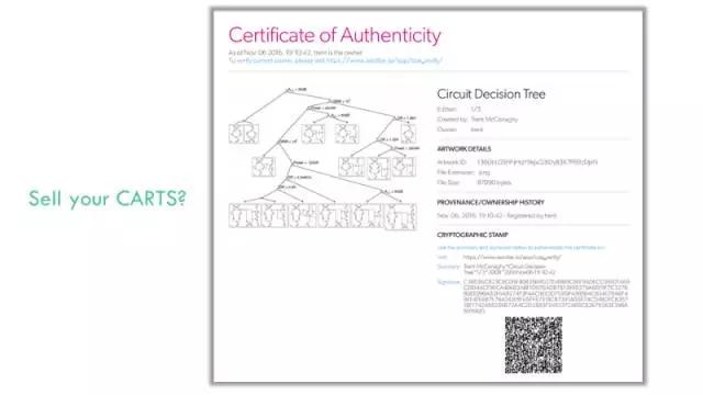 例如使用 ascribe 时,我声明了于几年前建立的一个人工智能模型的版权。该人工智能模型是一个决定使用哪种模拟电路拓扑的 CART(决策树)。这是它的密码防伪证书(Certificate of Authenticity /COA)。如果你想从我这获得一个许可版本,给我发电子邮件即可: )