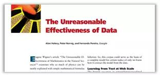 Banko 和 Brill 并不是唯一发现这个规律的人。例如,在 2007 年,谷歌研究人员 Halevy、Norvig 和 Pereira 发表了一篇文章,显示数据可以如何「不合理地有效」跨越许多人工智能领域。