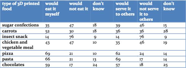 调查的第一个发现是,被调查者没有一个人听说过用3D打印来制造食物。
