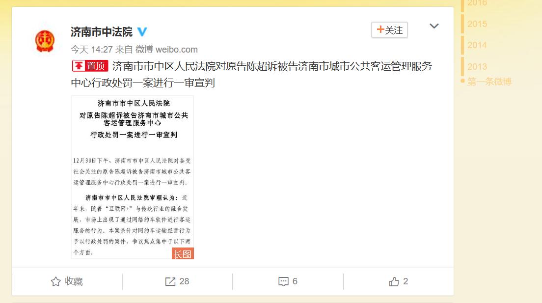 12月30日,山东省济南市市中区法院最终撤销了2015年2月13日济南市城市公共客运管理服务中心对网约车司机陈超的行政处罚。