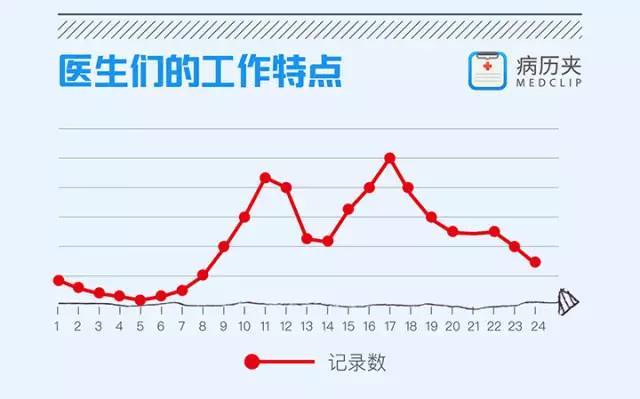 这张图片来自杏树林的报告,杏树林对此的解读是医生们的病历记录高峰在中午的11点及下午的5点。但我们从这张图中看到的内容却并不止于此。实际上,从这张图中我们可以看到,医生从早晨9点钟开始一直到晚上11点都处于强度相对比较高的工作状态。尤其是我们可以看到,医生在下午5点结束一天的工作之后,有长达7个小时的时间处在强度比较高的整理病历的状态中。