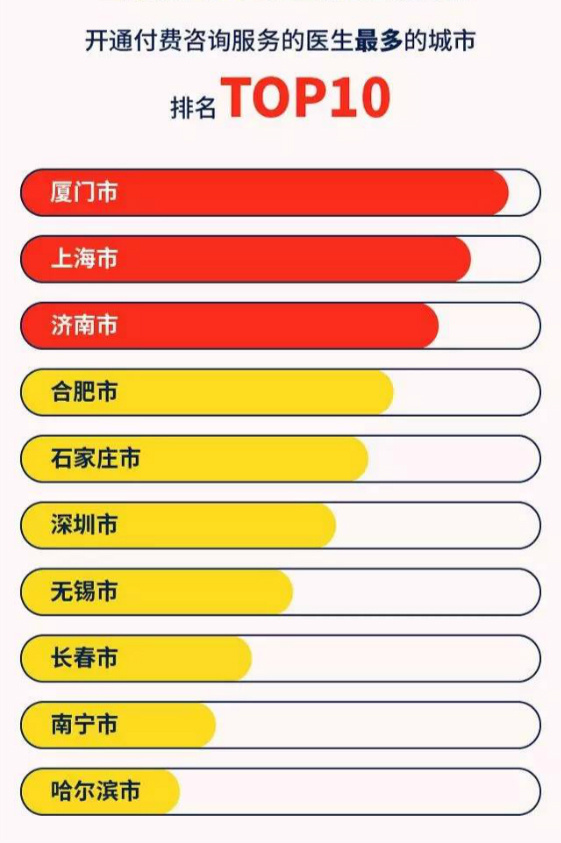 在当前背景下,医生服务效率提高后服务更多患者的一个有效途径就是提供在线咨询。而杏仁医生报告中的这两组数据非常有价值。无论是医生开通付费咨询的数量,还是患者付费咨询的意愿,二线城市都表现得非常活跃。这意味着,医生希望通过在线咨询提高自己的品牌、知名度以及收入,患者希望通过在线咨询方便快捷解决自己的就医问题,这样一条逻辑在二线城市是行得通的。