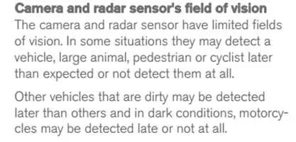 我们以某近百万顶级豪车的说明书为例,上面就很明确指出,在某些情况下可能完全无法检测到车辆、大型动物、行人和骑车人。这个特殊情况就是在车辆、大型动物、行人和骑车人在被前车或侧车遮盖住视线,前车不再遮挡后突然出现,系统无法及时识别,特斯拉几次事故都是如此。然后特别指出黑暗环境下,摩托车可能完全无法检测到。