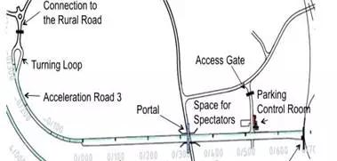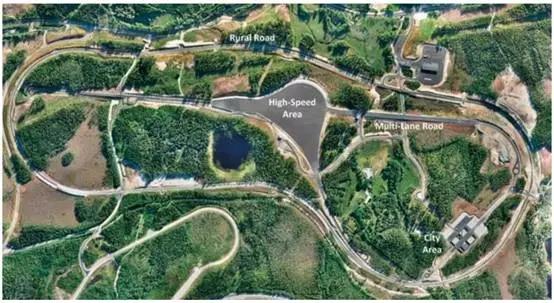 整个测试场分4个测试区,最外圈的乡村道路测试区,中间的高速测试区,右下角的城镇测试区和高速测试区右边的多车道测试区。全部道路都可承受60吨载重车辆通行,可允许25米长的车辆通行。