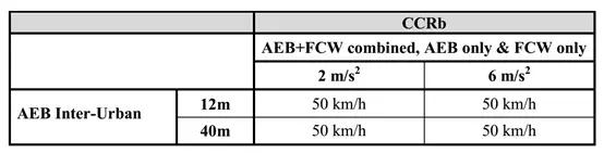 第三种是Car-to-Car Rear Braking(CCRb),前车与后车速度都保持时速50公里,距离在12-40米之间,前车开始减速,减速度在2-6m/s2之间。