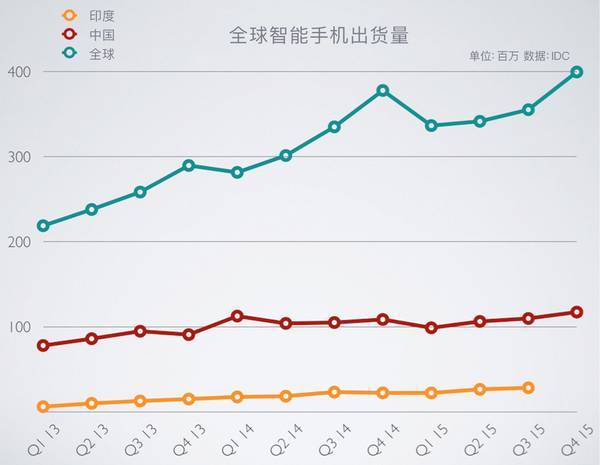 中国、印度和全球近三年的智能手机出货量情况,数据来源:IDC,制图:腾讯科技