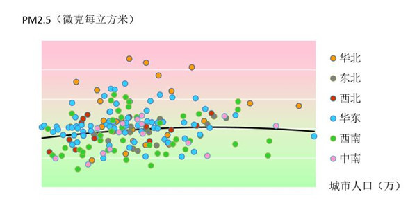 在扣除城市人口、所在省人口密度和人均GDP的影响后,雾霾严重程度依次为:华北、西北、东北、华东、西南、中南;而大中城市的雾霾比小城市略微严重,但特大城市的雾霾却并没有更严重。城市人口与雾霾程度相关性从正变负的转折点在300万人到400万人之间。对于人口超过400万的城市,虽然由于数据点不多,我们不能确切地说,城市人口越多,雾霾越轻,但至少可以认为,人口更多的城市雾霾也更重的判断与证据不符。