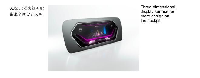大陆集团还开发了3D显示器,大陆集团认为,全数字化仪表对于数字化内容的灵活显示可能是比较理想的,但也可能会限制到设计的灵活性。因此,为了确保未来驾驶员既可享受到数字化内容,又无需盯着老式的平面媒体显示器,大陆集团开发了3D显示器,其特点是采用了局部光学贴合元件,可重现传统显示器的质感,设计个性化程度较高。