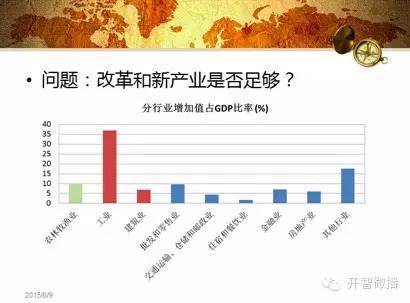 但是,现在的问题是,新的这些改革、修修补补和新增长点,能不能弥补过去粗笨行业去产能留下的坑?目前是不能。如果新产业能完全取代旧产业,那中国经济也就能突飞猛进发展下去了。工业、建筑业和房地产在 GDP 总额中所占比重还是很大,工业中的重化工业占比又比较高。新兴产业发展需要时间,而原本占比较小,一时也难以成为增长引擎。