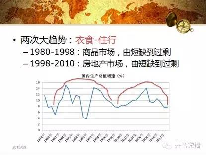 接下来这一段是我自己的分析。以最粗略的方式,我们可以把这两个长波段分成「衣食」和「住行」,前者代表商品,后者代表房地产和基础设施。现在这两个长波段都从短缺经济进入了过剩经济。