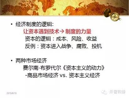 布罗代尔是什么意思呢?他的意思是,商品市场经济是从要素到销售,看我们这有什么,就卖出什么。而现代诞生的资本主义是驾驭资本,按照机遇,从全世界范围组织要素,这里的材料、那里的人口,通通根据需要组织起来。商品市场经济是局部性的,局限在自身地域资源上,资本驾驭者从一开始就是全球性的。