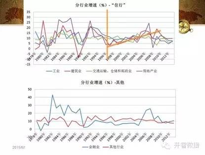 「住行」领域在八十年代增速波动也很大,自九八年之后开始一路平稳爬升,二零一零年后增速下滑,降到现在。而其他所有金融和服务业领域,基本上九十年代之后就一直保持比较的低速增长(金融危机前的金融行业有短期蹿升)。