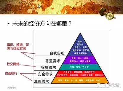 那么未来的方向在哪儿,从心理学的需求结构角度(当然我说的是最通俗的大众理解的心理学,从学术角度可能早已经对人的需求模型进行了批判和更新),衣食住行都属于最初的生理和安全需求。基本满足之后,新的需求就要往上挪移,经济需求也会向上挪移。
