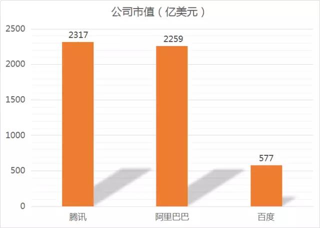 百度于2005年在纳斯达克上市,阿里巴巴于2014年在纽交所上市,腾讯于2004年在港交所上市。随着腾讯公布2016年第二季度财报后,腾讯股价大涨,超过阿里巴巴成为国内市值最高的科技公司。截止至2017年1月2日,腾讯市值达到2317亿美金,阿里巴巴2259亿美金紧随其后,百度为577亿美金垫底。