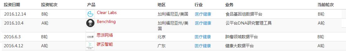 2016年,腾讯产业基金在医疗健康领域总共完成4笔投融资事件,陆续投资了大数据企业碳云智能、思派网络、Clear Labs等。腾讯互联网+合作事业部总经理陈广域曾表示:“医疗资源存在供需矛盾,医疗行业信息化存在参差不齐、数据分散问题,医疗信息质量良莠不齐、精准度低,这三点是目前行业痛点所在。腾讯希望聚焦自有的大数据能力、用户触达能力,以及互联网+资源整合能力,与合作伙伴一起建立高效的医疗分发平台。”