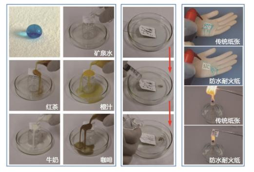 从实验图片来看,这种新型防水耐火纸对水和多种商业饮料,如矿泉水、橙汁、红茶、牛奶和咖啡等都呈现出防水性,并被放置到酒精灯上时,呈现出隔热耐火性。此外,这种纸张具有良好的自清洁功能,落在耐火纸上的水会形成球形水珠在纸的表面自由地滚动并带走灰尘等污物而实现自清洁。