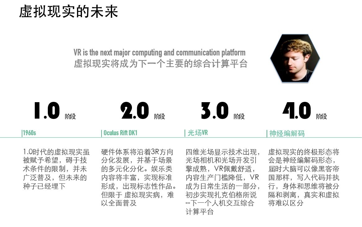 作为下一代的计算平台和信息文明下一个阶段的重要互联网新型应用,虚拟现实产业及其相关领域所承载的是个异常庞大和系统的产业,它在移动互联网产业充分发展的基础上强调了更为复合的应用体验。虽然虚拟产业已经历数十年艰难建设期,也经历了长时间的创想期和探索期,但也仅是刚刚越过产业1.0阶段。随着半导体工业与移动互联网的高速发展,虚拟现实开始迈入产业的2.0阶段。2.0阶段的跃进至今仅仅走过了不到十年,产业要真正进入虚拟现实2.0+全面爆发的业务领域,还要经历一些挑战。