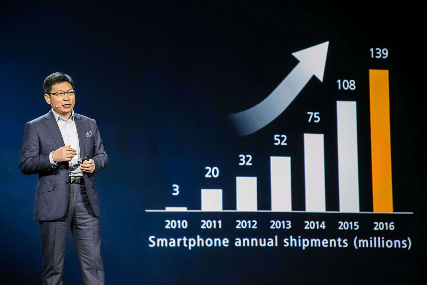 同一日,华为还公布了消费者业务的2016年全年业绩预期。2016年,华为消费者业务预计实现销售收入人民币1780亿元人民币,同比增长42%,连续五年实现稳健增长;智能手机发货量达到1.39亿台,同比增长29%。