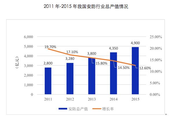 调研数据显示,2015年中国安防行业总产值达到 4900 亿元左右,全行业实现增加值约 1600 亿元。以往,国内的安防以人防+技防的传统安防为主。在传统安防模式下,主要通过闭路监控电视系统(CCTV)、门禁系统和防盗报警系统实现技防。