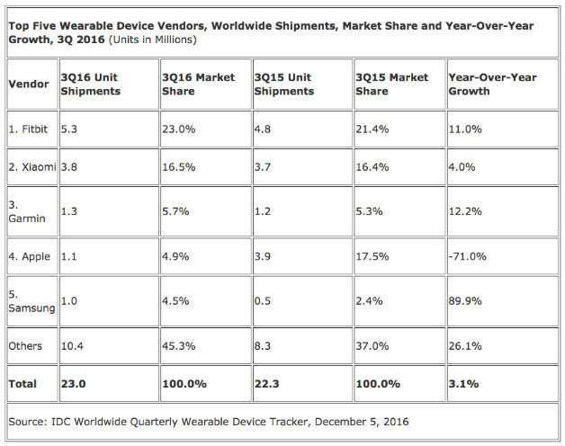 从数据来看,未来Fitbit的发展也并不轻松。来自中国的小米发展强劲,去年第三季度出货量380万只,市场占比16.5%,紧随其后。但去年同期小米的市场份额只有4%,涨幅达到4倍多。此前,华米(小米智能设备生产商)方面称,2016年公司智能可穿戴设备出货量超过1600万台。