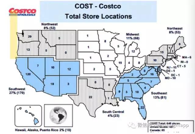 3)一个覆盖长尾,一个覆盖中等收入人群。两者的用户分层差异很大。曾经有一个笑话,说Sam's Club的许多用户都是拿粮食圈救济的,但从层面也反应了Sam's Club的用户层次。而Costco的是标准美国中等收入人群。从消费力,甚至用户人群看,美国的中等收入人群是最大的,也给Costco成长提供了广阔空间。下图是Coscto的店面分布情况,我们看到加州的店面数量是最多的,这也是美国中等收入人群数量最多的州。