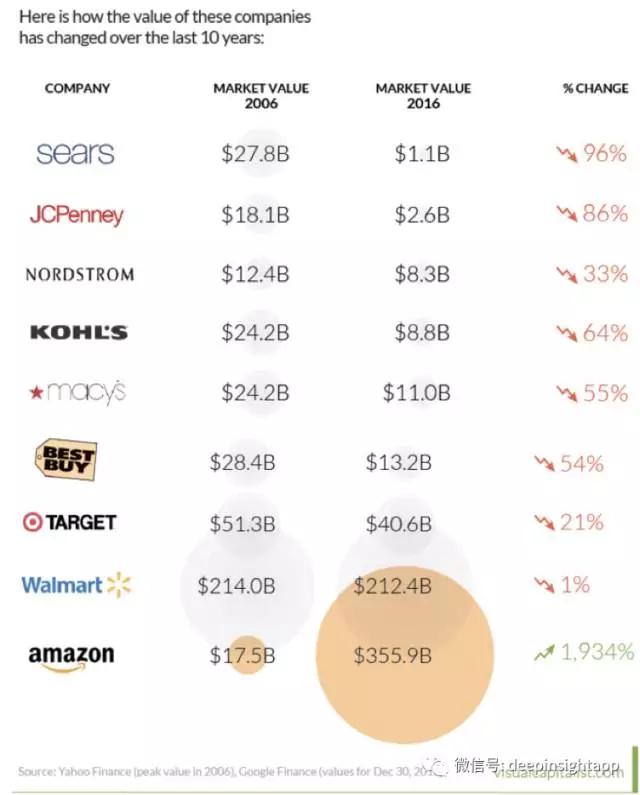 导读:昨天看到一个数据非常受启发:截止到2016年底,亚马逊的市值超过了3559亿美元。这个数字不仅仅超过了沃尔玛,而且比沃尔玛+Target+Nordstrom+Kohl's+JC Penny+Sears+百思买都大!过去十年电商不断在吃掉实体零售的蛋糕。十年前亚马逊的市值仅仅175亿美元,今天其市值增长超过20倍!