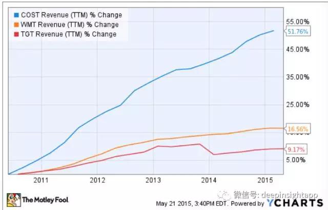 在上面这个名单中,我们看到过去十年传统零售中沃尔玛还算表现比较好的。十年市值几乎不变。当然这个成绩并不值得骄傲,如果算上通胀,美股的大牛市等因素,持有沃尔玛十年的相对收益和绝对收益都很差。但是有这么一家公司,2006到2016年之间上涨了5倍。这就是Costco好市多。虽然5倍的上涨在大牛市中并不惊人,但这是在亚马逊电商攻击的大背景下完成的。我们先看下面这张图,2011到2015年之间,Costco的TTM收入增长是51%。同期,沃尔玛只有16%,Target只有9%。今天我们就好好聊聊Costco的商业模式和其护城河,以及给我们的启发。
