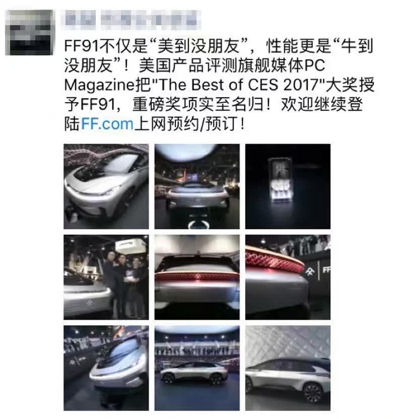 而国内,乐视给人营造的感觉一直是:FF就是乐视的公司,FF 91就是乐视的产品。乐视的公关总监对其马屁却拍得不亦乐乎:(下面朋友圈截图)