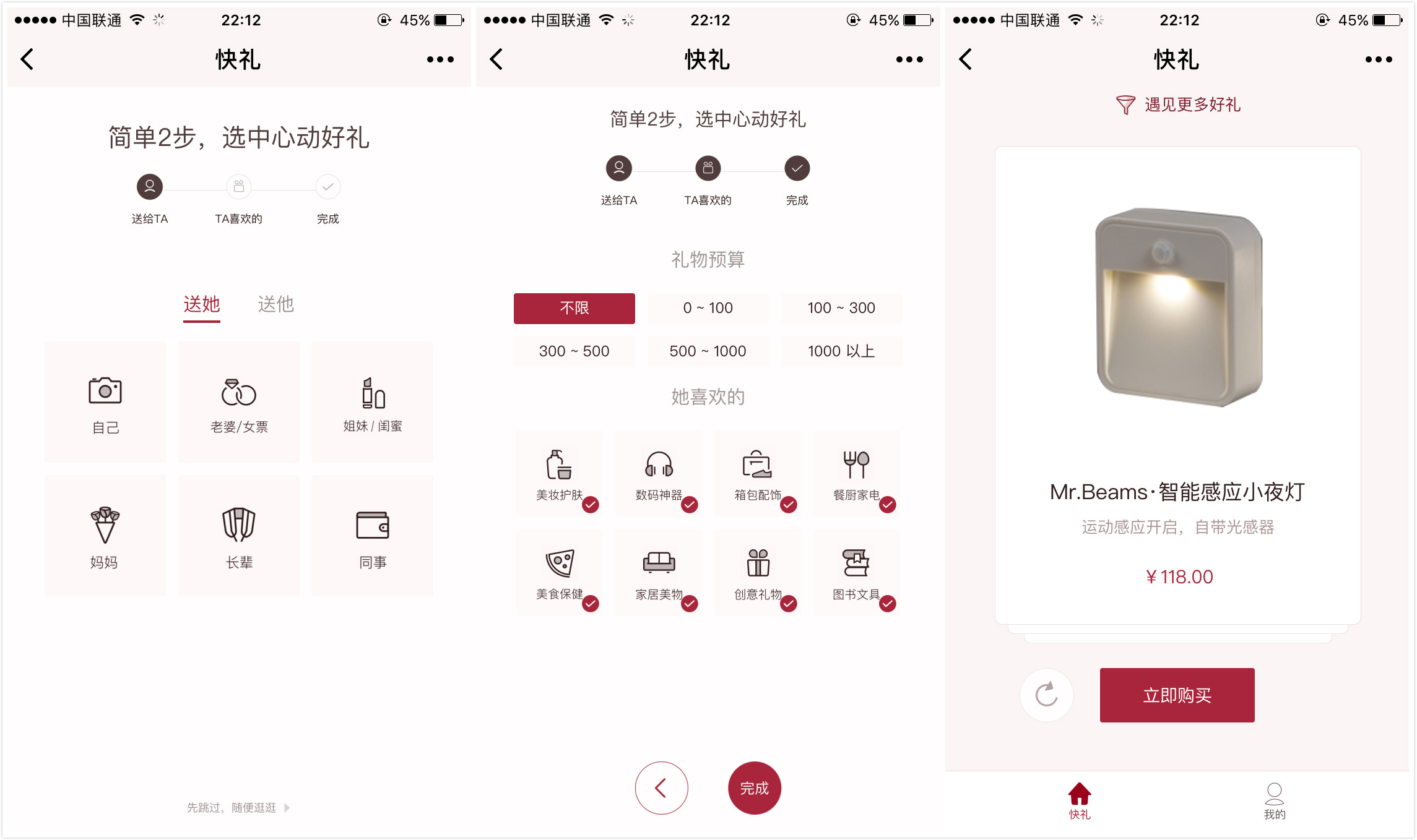 和礼物调选神器相比,礼物说做的小程序“快礼”更加精简,只有礼物筛选这一个功能,用户选择送礼对象、礼物类型、预算,就能得到一系列礼物推荐,并完成购买。