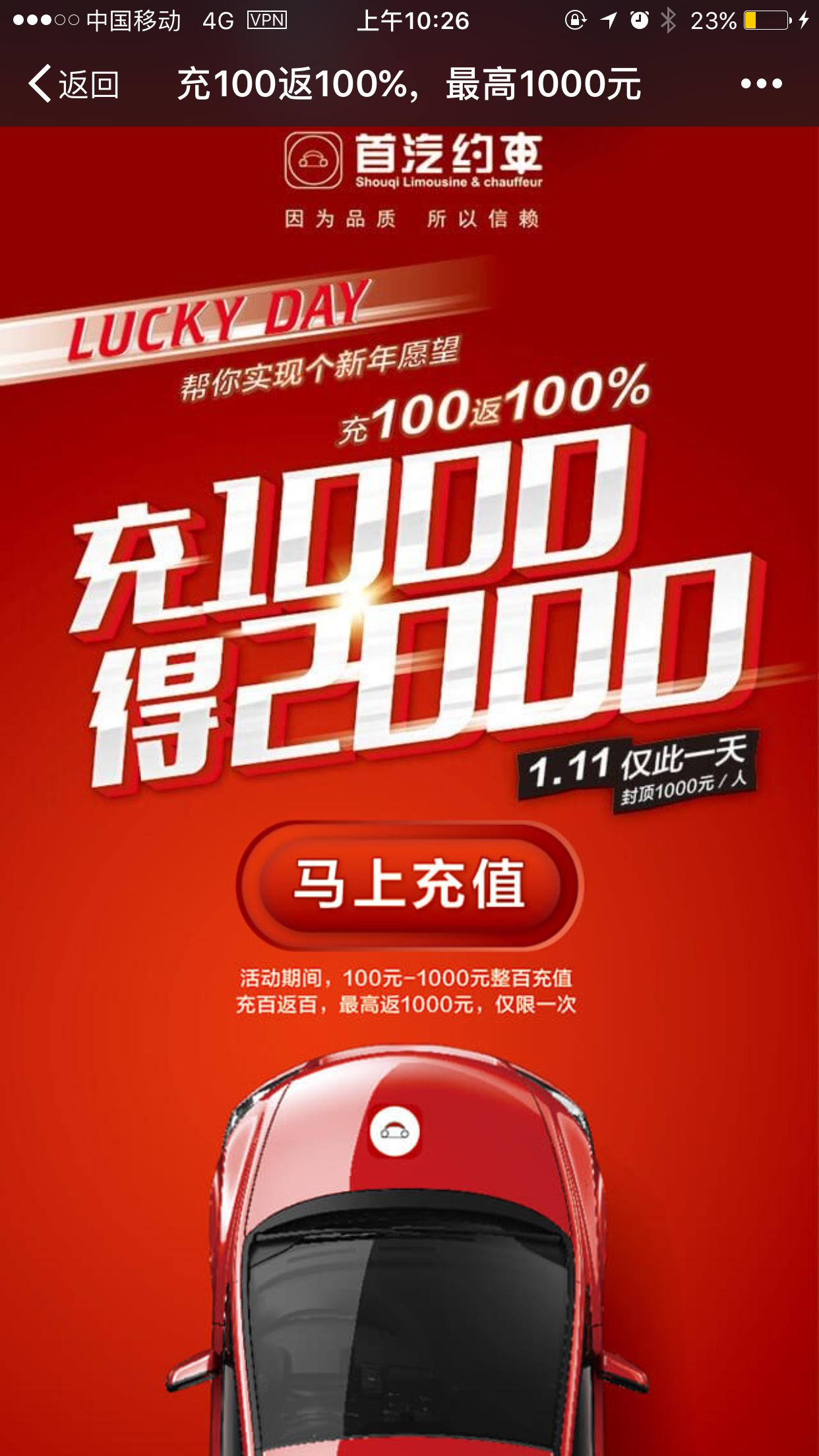 今天,首汽约车宣布,将在明天(1月11号,仅一天)开始充100返100的充返活动,活动期间,用户充值100-1000元的整百充值,可以充百返百,最高返1000元,同时,用户不能多次充值,只能充一次。举个例子,用户可以充值100,得到200元打车费;充值600得到1200打车费,最高只能充值1000元得到2000元打车费。