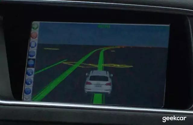 上图是车辆在到达一个十字路口时,车机上所显示的画面。其中我们可以看到的黄色的线是来自于激光雷达返回的信息,白色为摄像头捕捉到的车道线,绿色为传感器识别的前方可行驶的空间范围(Free Space Detection)。除此之外,摄像头还捕捉到了从十字路口另一方向驶来的车辆,以及交通信号灯。