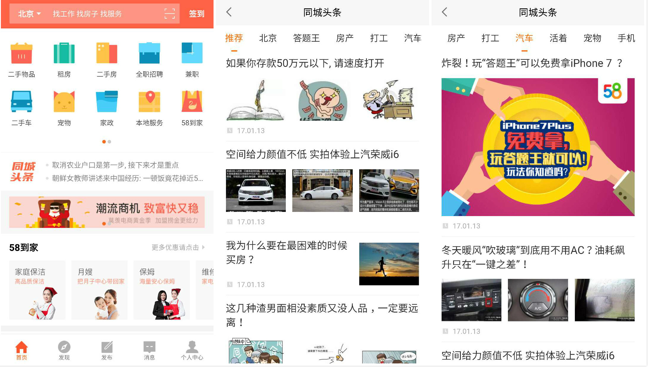 打开58同城App,已经能看到聚合生活类资讯的入口——“同城头条”了,目前同城头条一共只开启了九个栏目,分别是推荐、所在地、答题王、房产、打工、汽车、活着、宠物、手机,大部分与58业务密切相关。