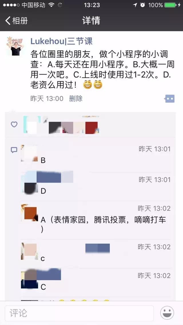 为了更好地了解大家对小程序的体验和持续使用的情况,我在朋友圈发起了一个小型的调查,这个调查是这样的: