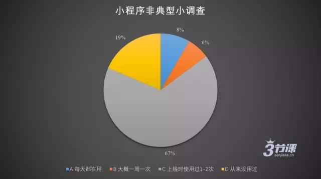 一个关于微信小程序的“非典型调查”显示:67%的用户只在微信小程序上线时“体验过一两次”,只有8%的用户在坚持每天使用。