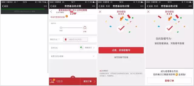 KFC目前已经支持自助下单,配餐后取餐业务(也许支持很久了,原谅我好久没吃KFC吧),其截图流程如下: