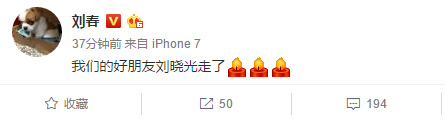 生前好友中南影业CEO刘春发微博表示哀悼。