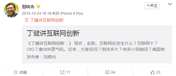 刘晓光生前更新的最后一条微博发于2015年10月24日,内容为丁健讲互联网创新。