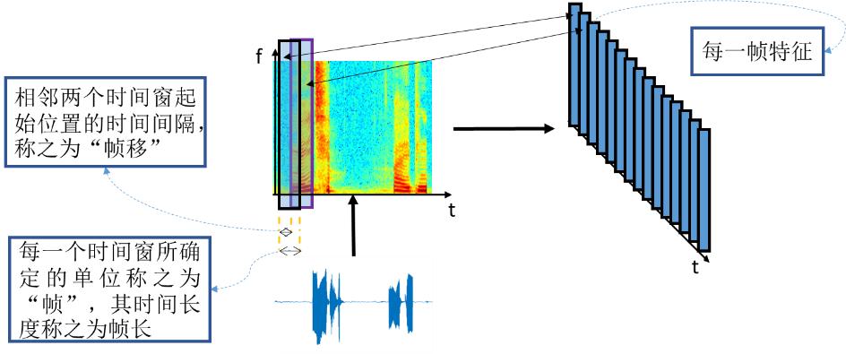 这个意思就是说语音信号的相关特征参数的分布规律在短时间(10-30ms)内可以认为是一致的,而在长时间来看则是有明显变化的。在数字信号处理时,一般而言我们都期望对平稳信号进行时频分析,从而提取特征。因此,在对语音信号进行特征提取的时候,我们会有一个20ms左右的时间窗,在这个时间窗内我们认为语音信号是平稳的。然后以这个窗为单位在语音信号上进行滑动,每一个时间窗都可以提取出一个能够表征这个时间窗内信号的特征,从而就得到了语音信号的特征序列。这个过程,我们称之为声学特征提取。这个特征能够表征出在这个时间窗内的语音信号相关信息。如下图所示: