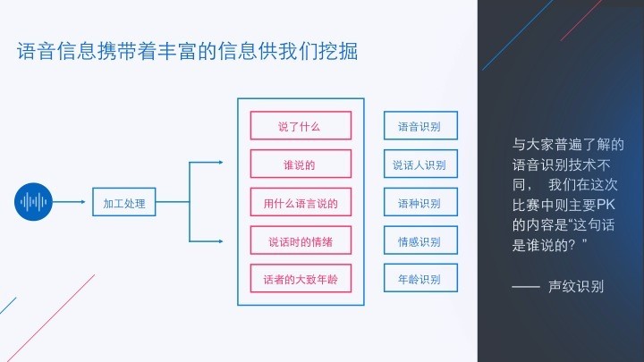 本次比赛对机器来说是声纹识别。声纹识别和语音识别的不同之处在于,它的目的不是识别语音的内容,而是识别说话人的身份。