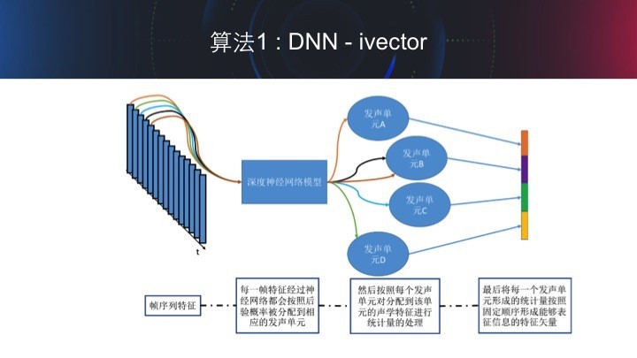 这是目前被广泛采用的声纹识别系统。其主要特点就是将之前提取的声学特征通过按照一定的发声单元对齐后投影到一个较低的线性空间中,然后进行说话人信息的挖掘。直观上来说,可以理解成是在挖掘“不同的人在发同一个音时的区别是什么”。
