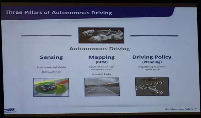 首先,Shashua 博士将自动驾驶分为了三个主要组成部分:Sensing, Mapping, Driving Policy。