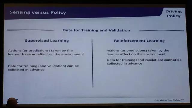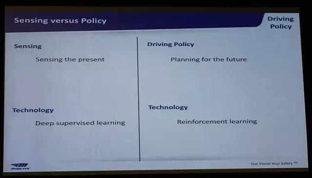 不过,Shashua 在对机器学习提出了更深一层的解读:他认为,目前被大部分公司所宣传的机器学习技术更多的是对车辆当下所处场景的感知与反应,因此这种技术应该被称为「深度监督式学习」(Deep Supervised Learning)。而获取更好的驾驶策略需要的是对未来场景的提前预判,因此其所需要的技术在机器人学中应当叫做「强化学习」(Reinforcement Learning)。