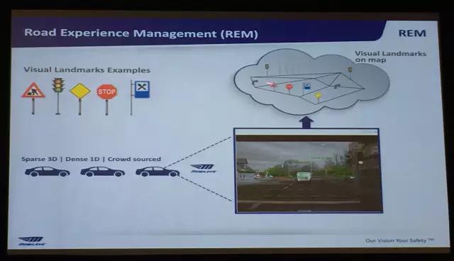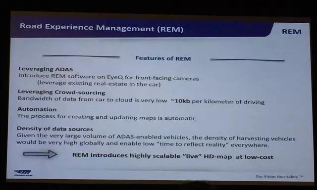 在地图方面,去年 CES 上,Mobileye 发布了其基于摄像头的地图定位技术 REM(Road Experience Management)——通过摄像头捕捉路面上的标识以辅助定位。由于目前大部分车辆都已经配备了前置摄像头,因此 REM 可以利用这些现有的摄像头辅助定位。