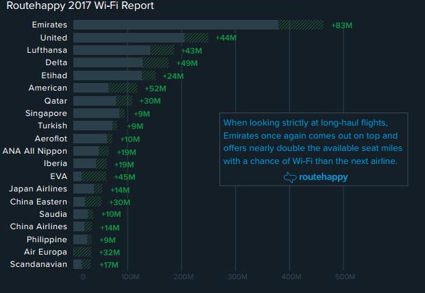 不过近两年,不少航司都已经具备了比较成熟的机上Wi-Fi技术,开始为其飞机布局高空上网业务,来满足旅客的需求。根据 Routehappy 发布的一项报告,目前全球共70多家航司提供Wi-Fi,同比增加11家,覆盖了全球大部分地区。2017年各大主要的航司,还将继续增加机上Wi-Fi,尤其是针对欧洲和亚太等长途跨国航线。