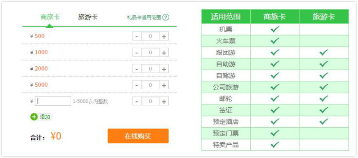 旅游网站提供商旅礼品卡并不新鲜,国内的不少网站也提供相应的服务。如途牛就提供旅游卡和商旅卡两种,后者可在途牛旅游网预订机票、火车票、跟团游、自助游、自驾游、公司旅游、邮轮、签证、预付酒店、预付门票、爆款产品、特卖产品。