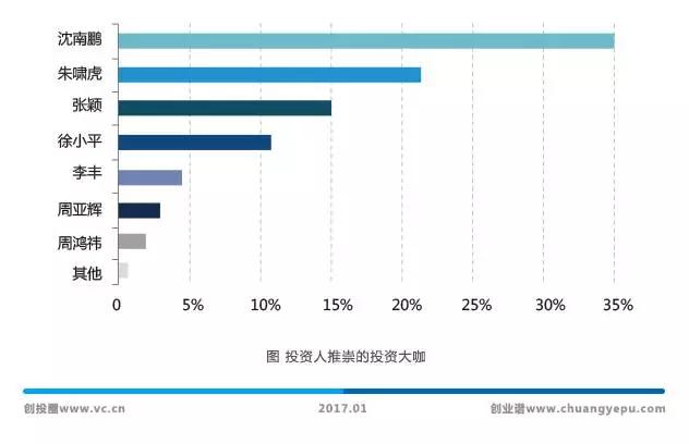 在“2016年投资人最推崇的投资大咖”的问题中,沈南鹏以占35%比例的领先票数当选,证明了投资界一哥的地位,紧随其后的有张颖,徐小平,李丰,这些投资人以2016年的项目成果,赢得了业界的推崇和尊重。