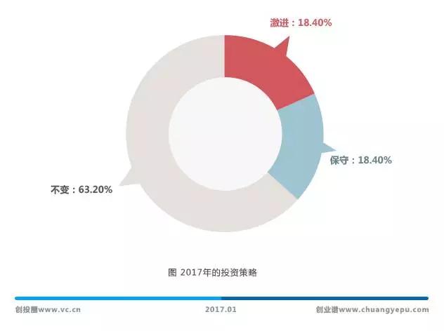 面对资本寒冬,投资人有哪些应对策略?调研显示,超过六成的投资人选择不改变投资策略,选择“激进”和“保守”的分别占约18%,可以看出2016投资人的投资策略以理性与保守为主,谨慎观望。报告认为,2017年大部分投资人的投资策略将会与2016的步调一致,谨慎和理智为主调。